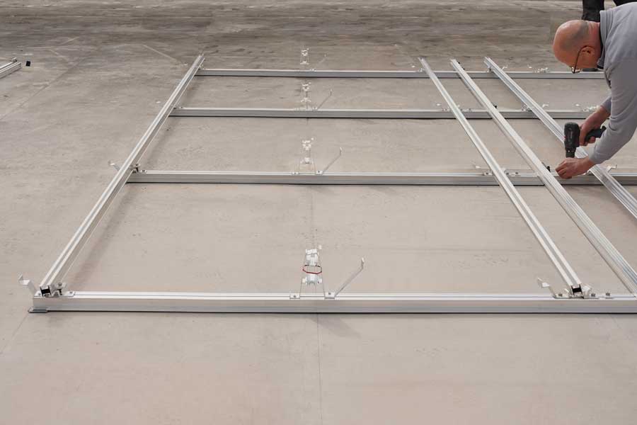 - Ausmessen + schnurschlagen (Randbereiche beachten) + vormontierte Aufständerungen positionieren