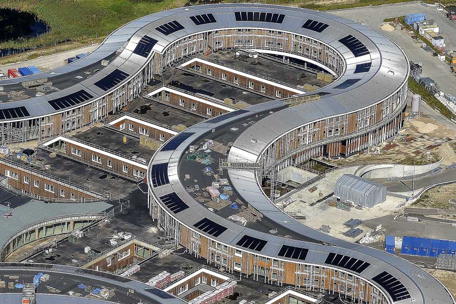 Dieses Projekt wurde mit Dachdurchdringenden Befestigungen realisiert. Um die Zahl der Montagepunkte zu reduzieren wurden Montagetische mit großen Spannweiten konstruiert.